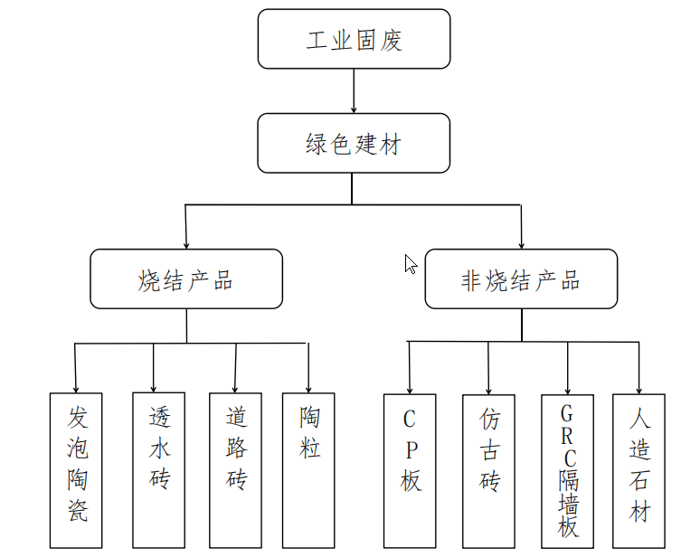 以工業(yè)固廢為主要原料,添加少量的膠凝材料或硅質(zhì)、石灰質(zhì)材料進(jìn)行化學(xué)反應(yīng),高壓或常壓養(yǎng)護(hù)制得的產(chǎn)品。產(chǎn)品有蒸壓灰砂磚、粉煤灰磚、人造石材、CP 板、道沿石、仿石材磚等。
