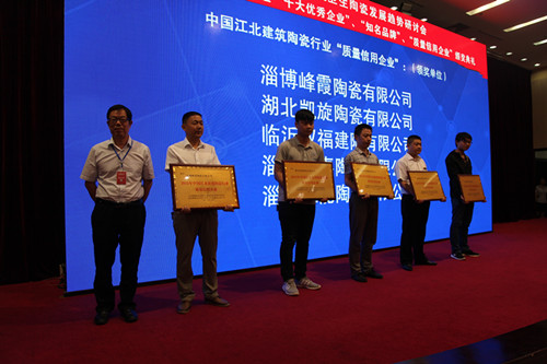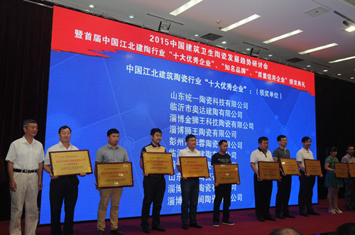 會(huì)上對(duì)2015首屆中國(guó)江北建筑陶瓷行業(yè)“十大優(yōu)秀企業(yè)”、“知名品牌”、“質(zhì)量信用企業(yè)”進(jìn)行了表彰和頒獎(jiǎng)。山東統(tǒng)一陶瓷科技有限公司、臨沂市奧達(dá)建陶有限公司等10家企業(yè)被評(píng)為2015首屆中國(guó)江北建筑陶瓷行業(yè)“十大優(yōu)秀企業(yè)”,“瓦倫蒂諾”、“米羅印象”等20個(gè)陶瓷品牌被評(píng)為2015首屆中國(guó)江北建筑陶瓷行業(yè)“知名品牌”,淄博獅王陶瓷有限公司、沈陽(yáng)新王者陶瓷有限公司等20家企業(yè)被評(píng)為2015首屆中國(guó)江北建筑陶瓷行業(yè)“質(zhì)量信用企業(yè)”。