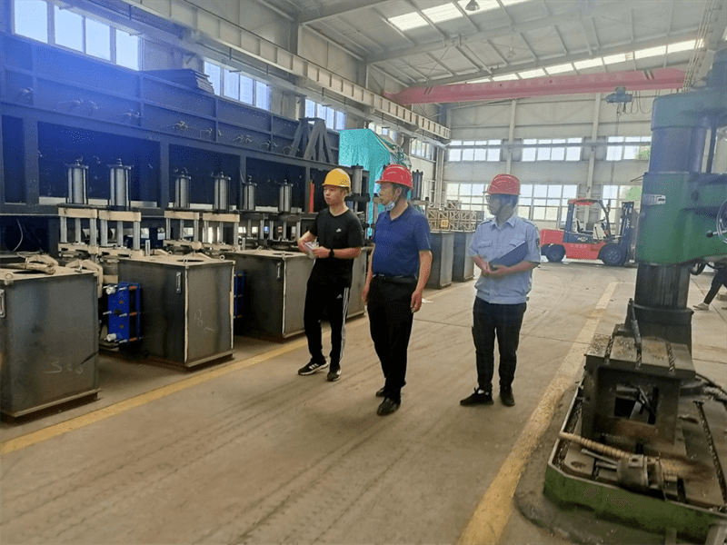 針對機械廠車間內(nèi)的安全隱患,王柱與安全員一一溝通,指出問題所在及解決的辦法,督促他們立行立改。
